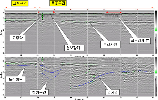 < öµµ³ë¹ÝÁ¶»ç ÀÚ·á1>ÀÇ »ó´ÜÀÚ·á´Â ±³·®±¸°£°ú Åä°ø±¸°£ÀÌ ¿¬°áµÇ´Â ºÎ±Ù¿¡¼ ÃøÁ¤ÇÑ ÀÚ·áÀÌ´Ù. 0m ±íÀÌ¿¡ öµµ·¹ÀÏÀ» º¼ ¼ö ÀÖÀ¸¸ç 50-70cm ±íÀÌ¿¡ µµ»óÇÏ´ÜÀ» º¼ ¼ö ÀÖ´Ù. ¿¬°áºÎÀ§¸¦ Áö³ª Åä°ø±¸°£ ½ÃÀÛÁ¡ÀÎ 20-30m ±¸°£¿¡ µµ»óÇϺΰ¡ ħÇϵǾîÀÖÀ½À» º¼ ¼ö ÀÖ´Ù.